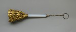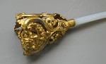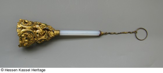 Bronzeblech vergoldet, gedrückt. Kelch aus drei gleichen Teilen verlötet. Kaltemailbemalung in Hellblau, Weiß, Grün; Griff aus Chalzedon. |