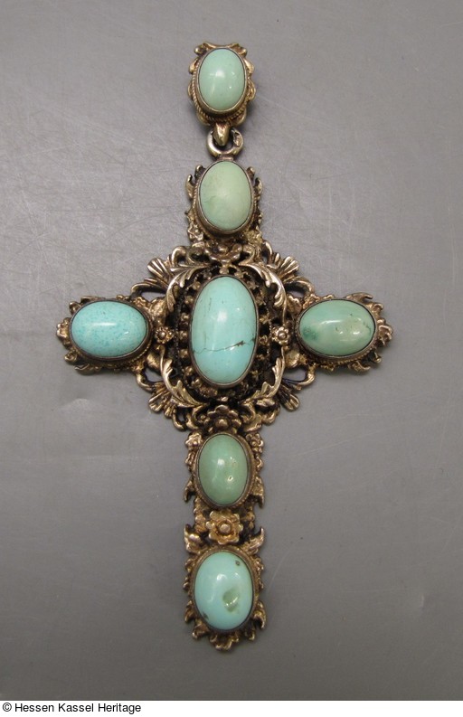 Kreuzanhänger aus Silber, besetzt mit Türkisen |