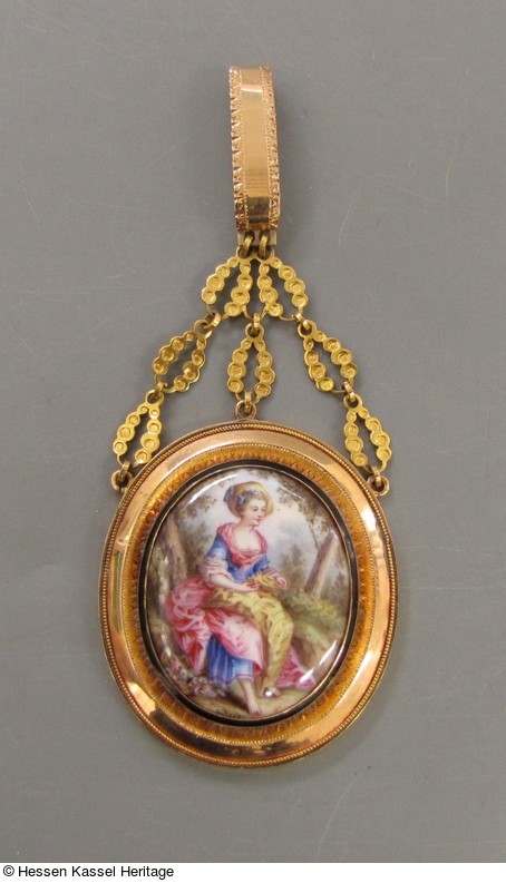 Gold, gedrückt, graviert, punziert, ziseliert. Schwarzes Email, Maleremail. Ursprünglich Medaillon (Lotreste). |