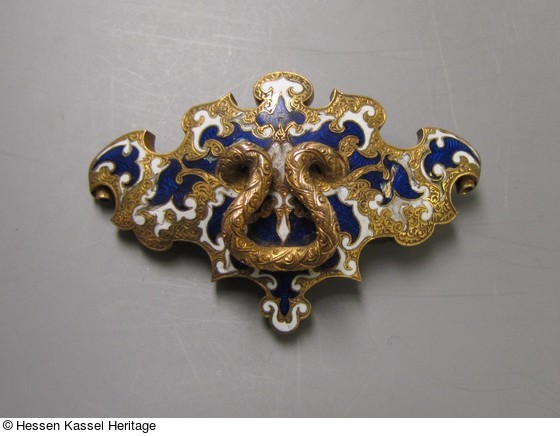 Silber vergoldet, gegossen, graviert. Weißes und blaues Email. |