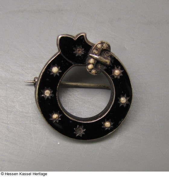 Silberne, runde Brosche in Form eines geschlossenen Riemens mit schwarzem Email (Trauerschmuck)