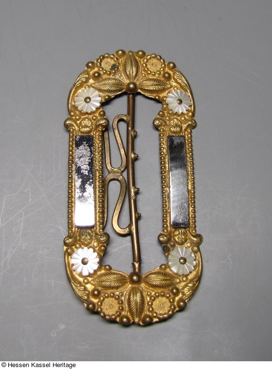 Semilor (Kupferlegierung), vergoldet, polierter Stahl, gedrückt, gesägt. Perlmutt. Die vier Halterungsdornen an der drehbaren Mittelachse sind abgebrochen. |