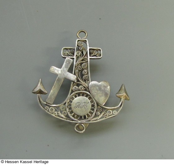 Silberner Schlüsselhalter mit Filigran, zusammengesetzt aus den Symbolen Glaube, Liebe und Hoffnung