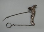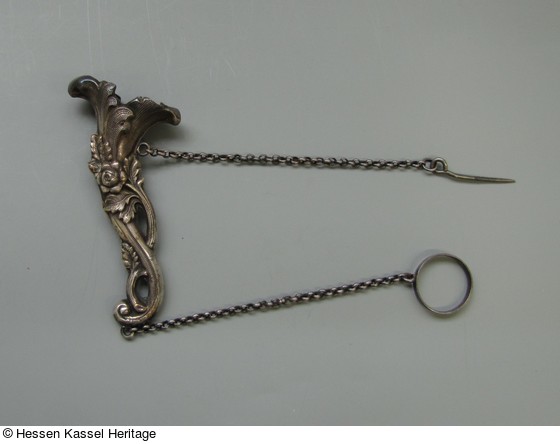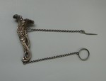 Silberblech gedrückt, aus zwei Teilen gefertigt, zwei Erbsketten mit Nadel und Ring. |