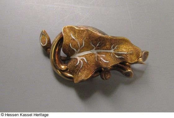 Silbervergoldete Brosche in Form eines länglichen Blattes, das durch einen zusammengebogenen Blattstiel gesteckt ist