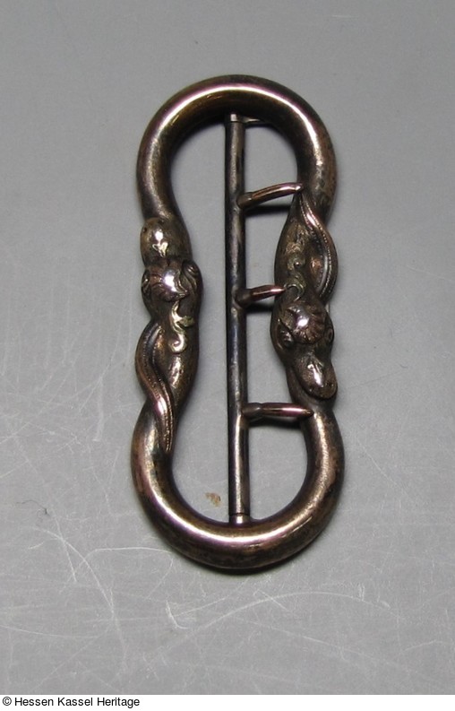 Kleine, silbervergoldete Gürtelschnalle aus zwei in sich verbissenen Schlangen |