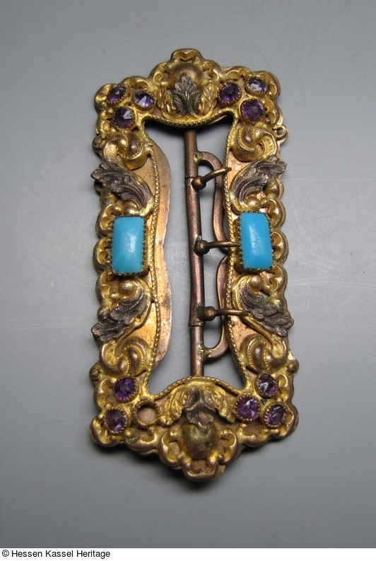 Semilor (Kupferlegierung), vergoldet, teilweise versilbert, gesägt, gedrückt. Violette, facettierte und blaue, mugelige Glassteine in Kastenfassung. |