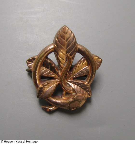 Bronzevergoldete Brosche in Form eines Kastanienblattes, das eine Schlange umringelt