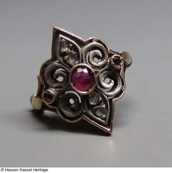 4 Altschliffdiamanten auf Silber in Pavé-Fassung, 3 Rubine in goldener Kastenfassung, mit Gold verbödet. |