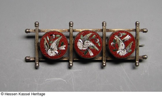 Silbervergoldete Brosche mit drei Glasmosaiken