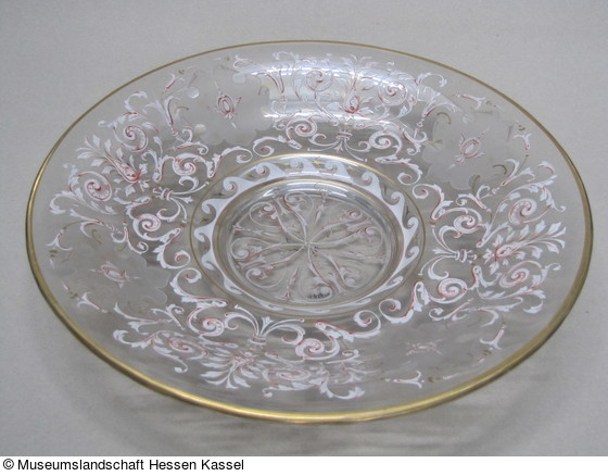 Farbloses Glas, teilweise geätzt, weiße, rote und goldene Emailmalerei. |