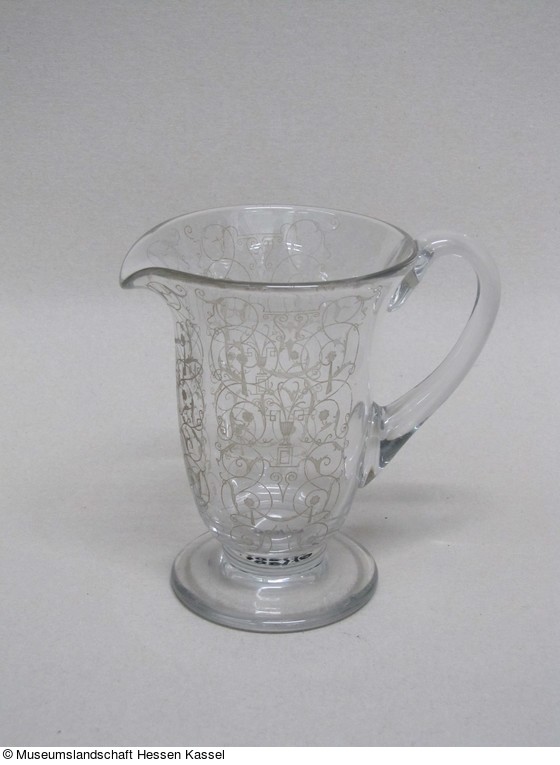 Farbloses Glas, mundgeblasen, Hefteisenabriß ausgeschliffen. Henkel angesetzt. Dekor mit Guillochiermaschine radiert und durch Ätzung mattiert. |