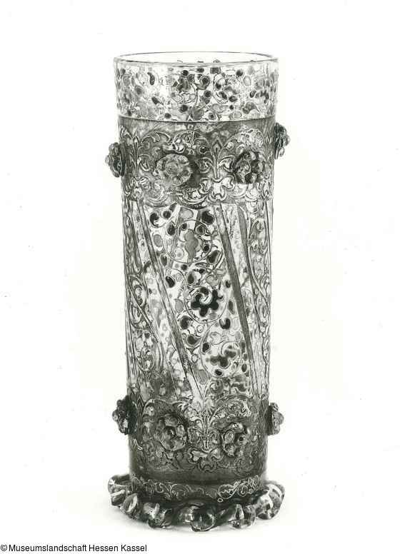 Oliv-gebräuntes Glas, geätzt, mit Goldauflage und Emailfarben bemalt, aufgeschmolzener Fußrand und Nuppen. |