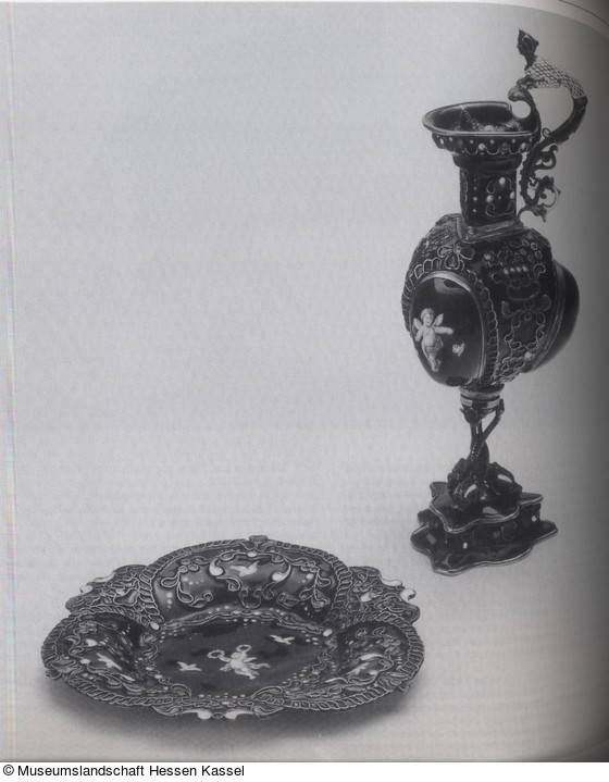 Zierkanne und Teller aus emailliertem Silber |