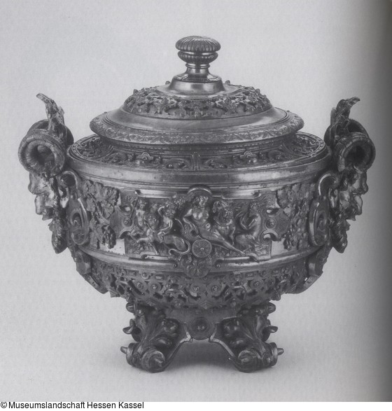 Die Bowle ist größtenteils zweischalig gearbeitet. Zinnlegierung. Die durchbrochenen Teile durch Verschraubung angesetzt. Gegossen, gedrückt, gepreßt. Galvanische Vergoldung, bronzefarben gelüstert. Aus 27 Teilen gefertigt. |