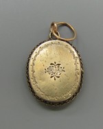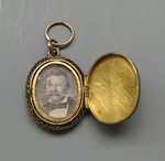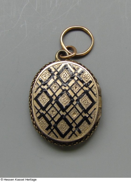 Silber, teilvergoldet, punziert, graviert. Schwarzes Email, Foto unter Glas. |