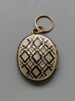 Silbervergoldetes Medaillon mit schachbrettartigem Ornament in schwarzem Email auf Deckel |