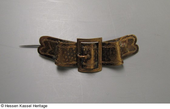 Bronzene Brosche in Form eines in Falten gelegten Gürtels mit Schnalle