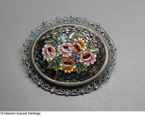 Breitovale Brosche mit Glasmosaik-Bild (Blumen) in Silberfassung |