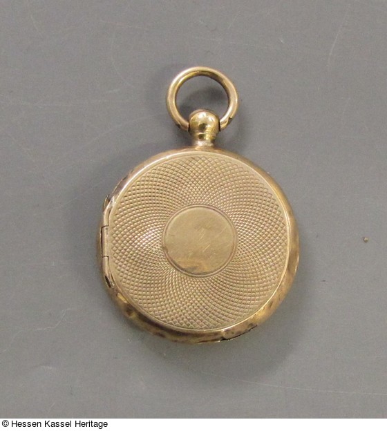 Kleines rundes Medaillon in Taschenuhrenform mit hellblauem und schwarzem Email |