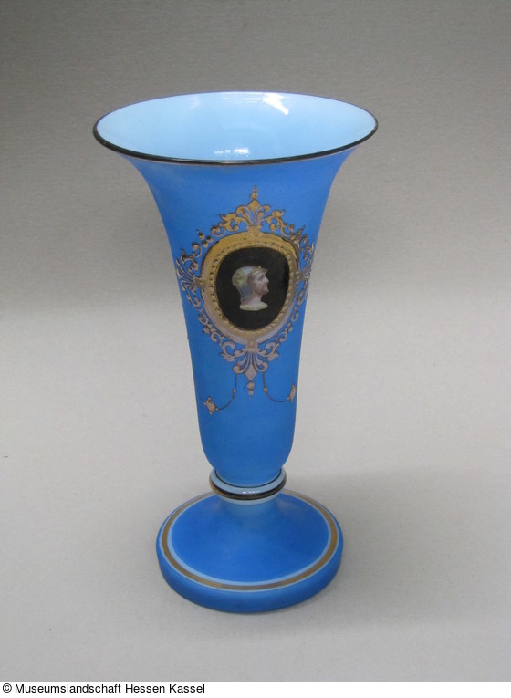 Milchglas,blaue, eingebrannte Lasurfarbe, weiße, schwarze und goldene Emailfarbe, Umdruckdekor.