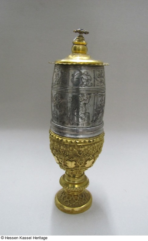 Silber, innen vergoldet, graviert. Bronzeblech, vergoldet, getrieben. Aus 7 Teilen gefertigt (3 aus Silber, 4 aus vergoldetem Bronzeblech). |