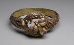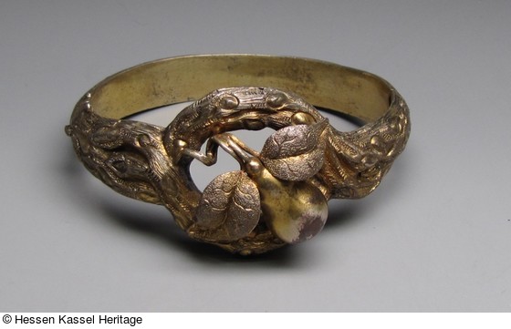 Kupfervergoldeter Armreif in Form eines naturalistischen Astes mit einer plastischen Birne