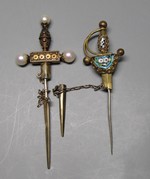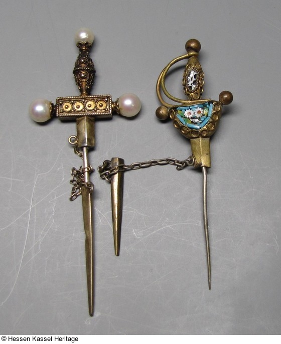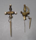 Zwei vergoldete Busennadeln in Form eines Degens bzw. eines Schwertes mit Scheiden und Sicherheitsketten