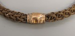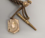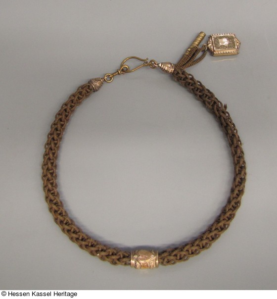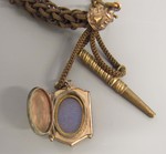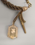 Uhrenkette aus Haaren in kupfervergoldeten Schuhen mit Medaillon und Uhrenschlüssel
