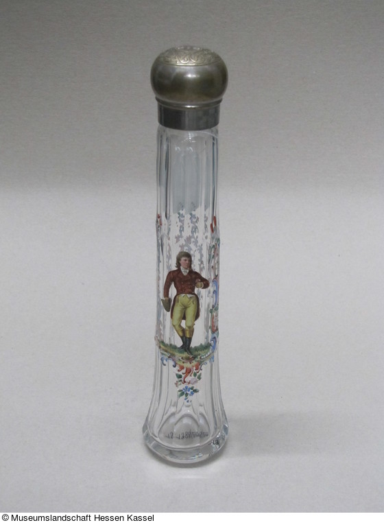 Farbloses Glas, mundgeblasen, Hefteisenabriß ausgeschliffen, Schälschliff. Bunte Emailmalerei. Schraubverschluß aus versilbertem Messingblech. |
