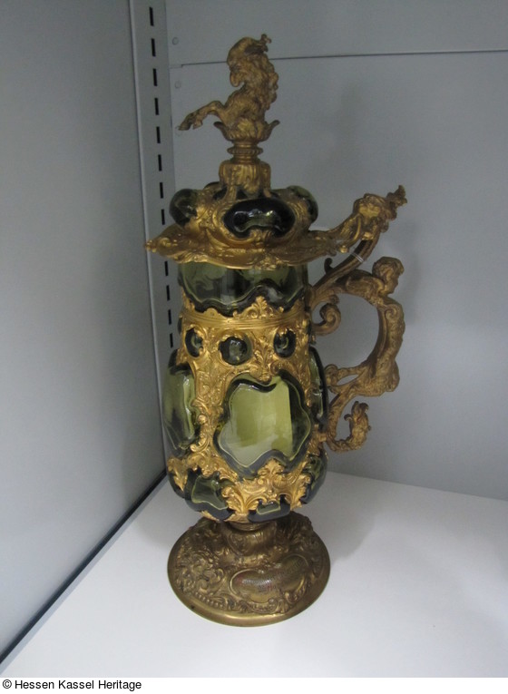 Prunkkrug aus Bronze mit eingeblasenem Glas