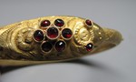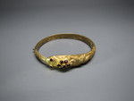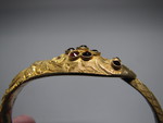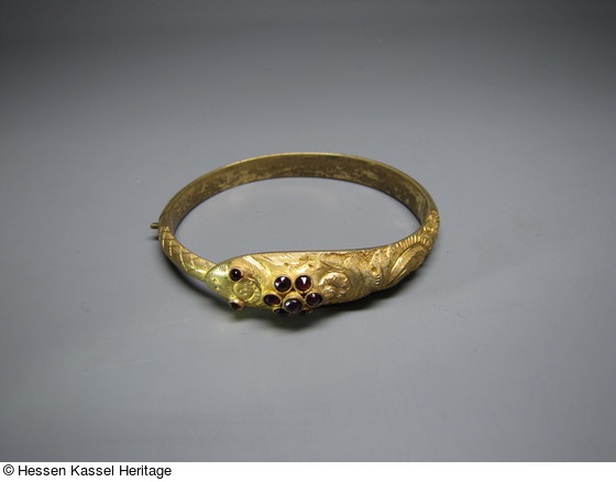 Vergoldeter, ovaler Armreif in Form einer Schlange, die sich in den Schwanz beißt, mit Granaten besetzt |