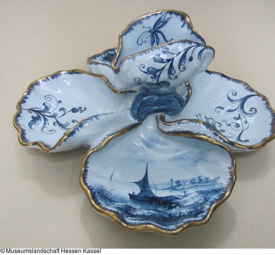 Fayence, bläulich-weiße Zinnglasur, kobaltblaue Bemalung, Goldrand. |