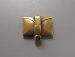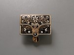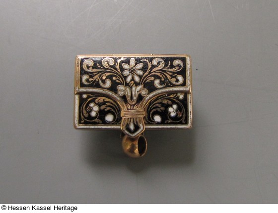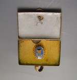 Messing, rotvergoldet, innen feinvergoldet, gegossen. Weißes und schwarzes Email (außen), weißes, blaues, grünes, gelbes und violettes Email (innen).