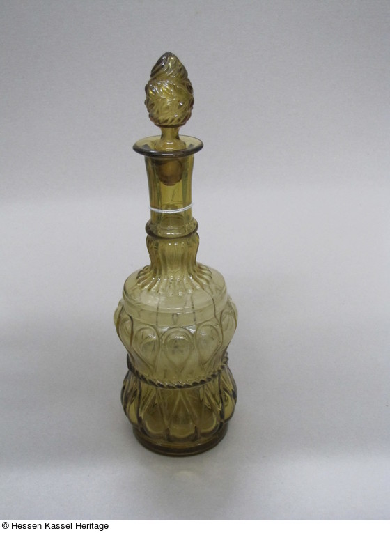 Durchsichtiges hellbraunes Glas, luftgepreßt, aus dreiteiliger Form, Nähte belassen. Das Gleiche gilt für den Stöpsel. |