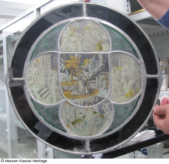 Runde Kabinettscheibe mit fünf Szenen aus der Leidensgeschichte Christi (Ölberg bis Kreuztragung) |