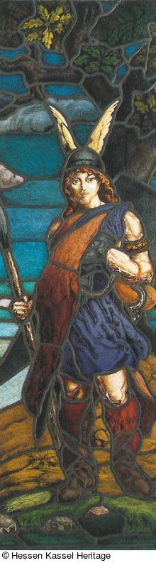 Mundgeblasenes Echt-Antikfarbglas, rotes Überfangglas, Bemalung mit Schwarzlotkontur, bräunlich und grau gewischter und radierter Überzug sowie naßgestupfter Übrzug zur Flächenschattierung, originales Bleinetz. |