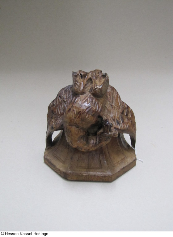 Eichenholz, aus einem Stück geschnitzt, ungefaßt. Oben und hinten Bohrlöcher. |