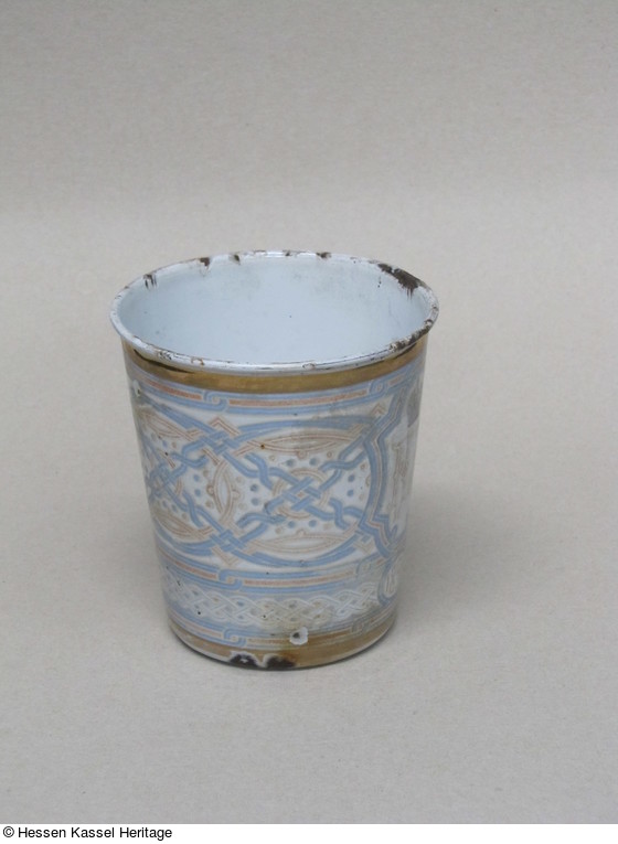 Weißes Flächenemail mit hellblau, gelb, Rostrot und Poliergold auf mit schwarzem Email abgedecktem Eisenblech. |