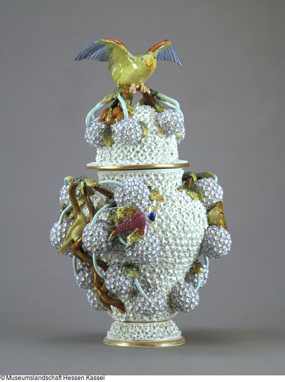 Seit 1739 schuf Johann Joachim Kaendler (1706-1775) für die Meißener Manufaktur in vielen Abewandlungen Gefäße mit freiplastischem Schneeballenblütendekor. So war eine 1741 als Repräsentationsgeschenk für den französischen Hof hergestellte, mehr als 50 cm hohe Vase mit dem Medaillonbildnis Ludwig XV. mit Blütenbällen überladen. Diese in der Herstellung sehr aufwendigen Gefäße faszinierten auch im 19. Jahrhundert die Porzellanliebhaber und wurden in Meissen weiterhin geformt. Andere Manufakturen imitierten die erfolgreichen Modelle, in Deutschland vor allem Dresden Stadt und Potschappel.