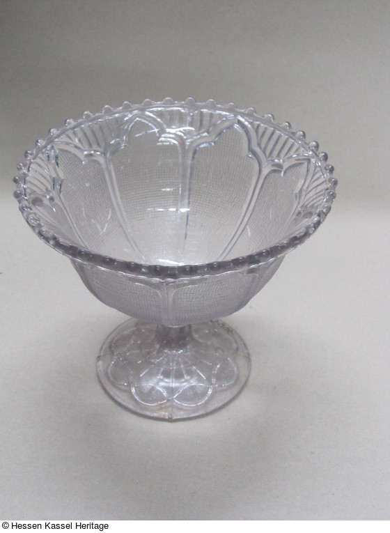 Farbloses Preßglas, vierteilige Form, stempelgepreßt, die Nähte sind sichtbar belassen. |