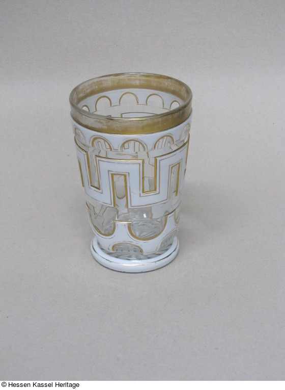 Farbloses Glas, mit weißem Zinnemail (mit Ausnahme der Lippe) überfangen. Kugel-, Kerb- und Schälschliff, Kaltgoldstaffierung, berieben. |