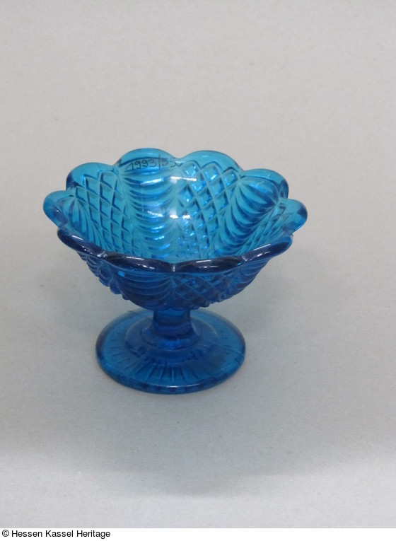 Hellblaues Preßglas aus dreiteiliger Form, stempelgepreßt; die Nähte sind belassen. |