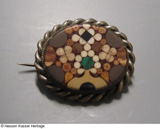 Breitovale Brosche mit Steinmosaikbild (stilisierter Blumenstrauß) aus Karlsbader Kalksinter in versilberter Bronzefassung |