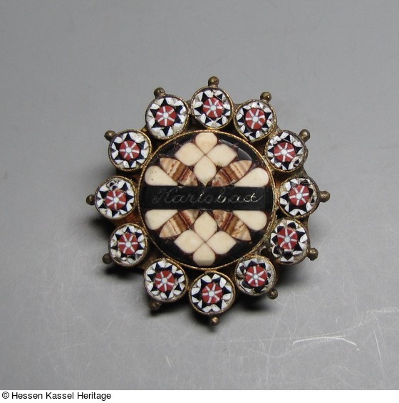 Mosaik aus verschiedenfarbigen Plättchen in weißlichen, braunen und roten Tönen aus eisenhaltigem Kalksinter des Karlbader Sprudels, schwarze Verbundmasse, Glasmosaik in roten, weißen und schwarzen Steinchen, Kupfelegierung, vergoldet. |