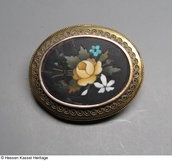 Kupfer vergoldet, Steinmosaik aus weißer Koralle und verschiedenfarbigen Marmorarten auf schwarzer Masse. Anstecknadel später, ursprünglich queroval. |