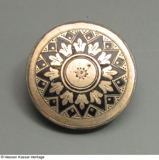 Bronzeblech vergoldet (platiert), punziert und graviert. Schwarzes Email, Stahlblattfeder. |