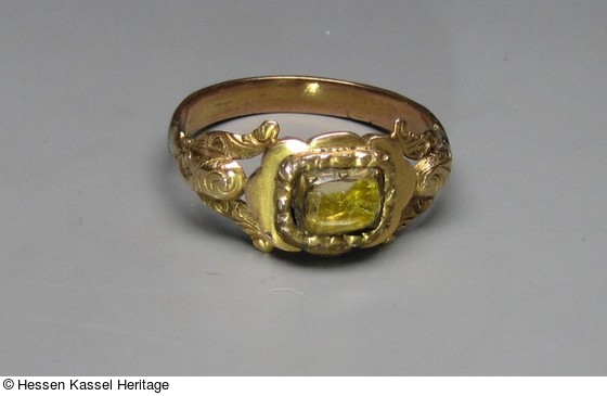Gold gedrückt, ziseliert, Glasstein, geschliffen, mit Farblack hinterlegt. |