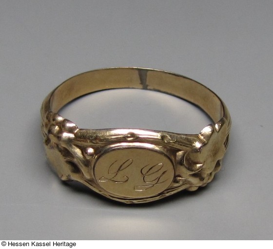 Silbervergoldeter Ring verziert mit Weinlaub und Trauben sowie den Besitzerinitialen LG