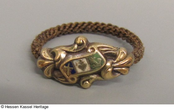 Silber vergoldet, gedrückt. Email in Blau, Weiß, Grün; Haar geflochten. |